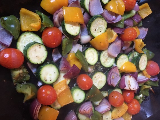 In a large baking tray arrange the chopped vegetables and drizzle some olive oil and sprinkle salt and pepper, mixed herbs and garlic. Toss all this together so all the vegetables are coated with the seasoning. Bake in the oven on gas mark 4 (180) for about 30 minutes until the veg is slightly brown.