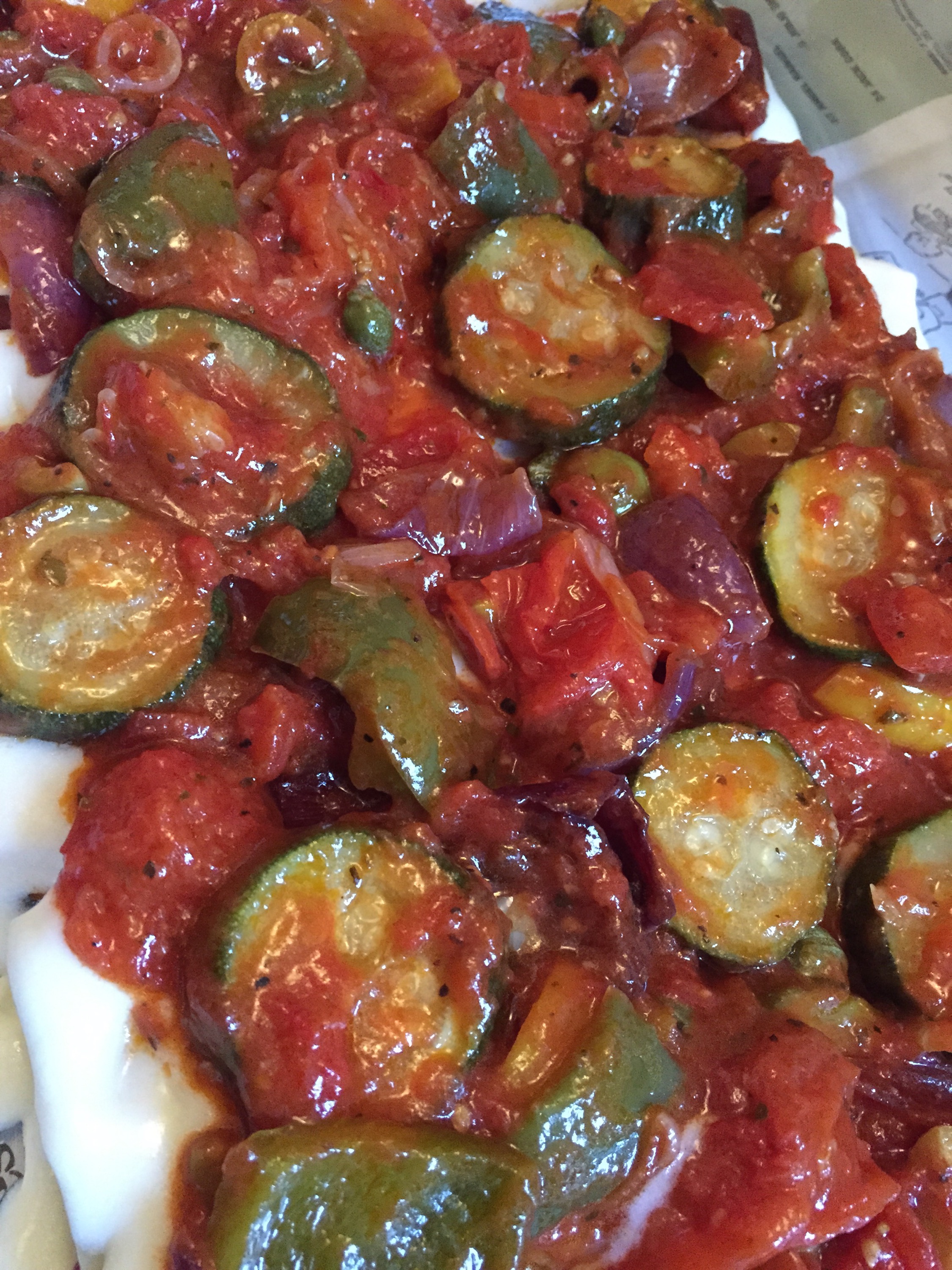 Once the vegetables are roasted put them in a saucepan and to that add the pasta sauce and the chopped tinned tomatoes. Also add the olives and capers. Taste again for seasoning and add if necessary. Cook this on medium heat on cooker for around 7-10 minutes.