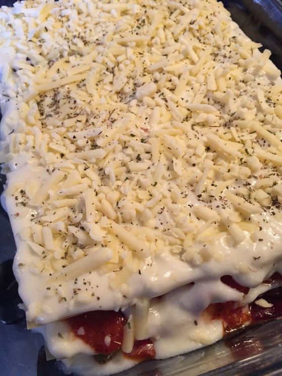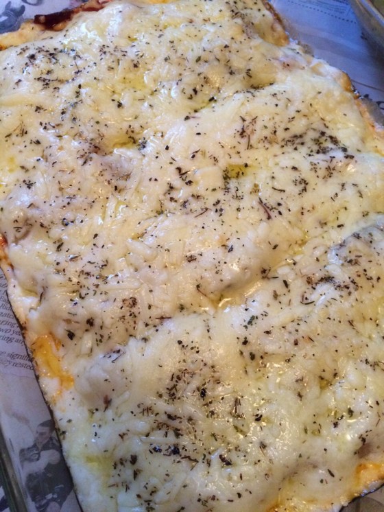Now all the components are ready we can start layering. On the bottom of a large rectangle Pyrex dish spread a couple of tbsp of the cheese sauce. Arrange the lasagne sheets and spread another couple of tbsp of cheese sauce on top of the sheets. Spread the vegetable filling on top, you can also sprinkle some grated cheese and then another layer of lasagne sheets and repeat this one more time. On the last layer of lasagne sheets pour more cheese sauce and sprinkle some grated cheese and mixed herbs or oregano. Bake in oven on gas mark 4 (180) for 30 minutes until the top is slightly golden and the lasagne sheets are cooked. I prefer mine soft so take it out before it’s too golden. This is lovely with a side salad.