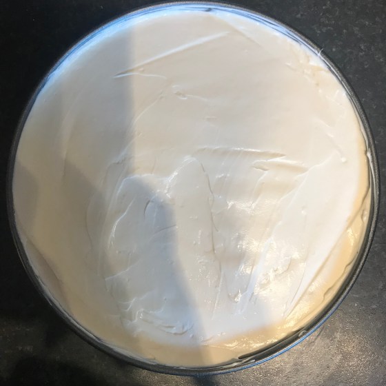 Add the melted butter to the crushed digestives and mix and then press into a springform cake tin and then put in the fridge to chill