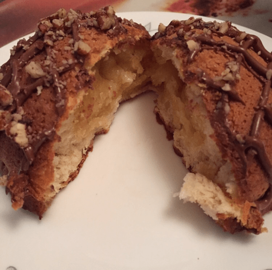 Spread the cream cheese topping generously onto the warm rolls and also scatter the chopped nuts (one seems to be pinched 🙄)