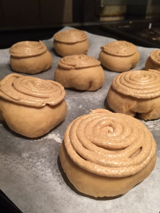 Once they have doubled, remove the cling film and bake in the preheated oven on gas mark 5 or 180 degrees for 20-25 mins until golden. Keep an eye on them as they don’t want to be too dark.
