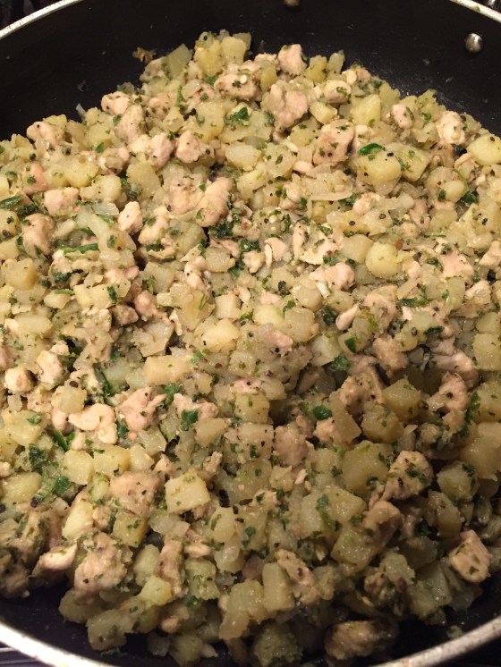 Let this all cook together on medium heat until most of the water has burned off. When there is still a little water remaining add the boiled potatoes and mix gently until everything is combined. Allow the mixture to cook for a few minutes until the potatoes are cooked and then add the chopped onions and cook together until no moisture remains in the mixture.