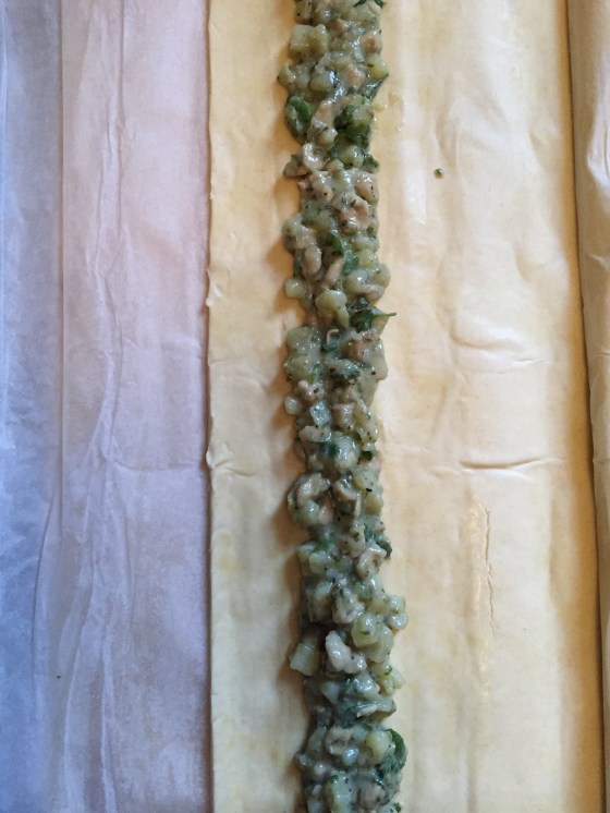 Take some of the pastry filling and layer it in a neat row as show, leave some puff pastry on the left side to over lap the mix